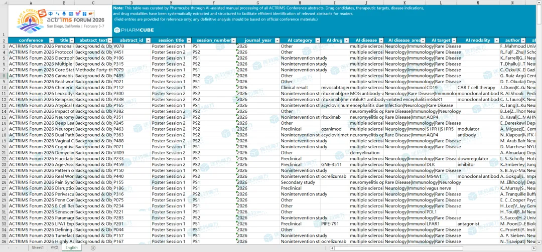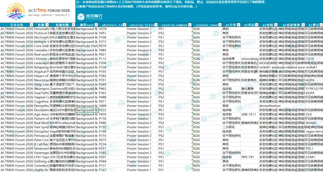 近日,ACTRIMS官方公布了本次大会摘要内容。医药魔方对本届大会近余500条摘要内容数据进行了整合清洗,借助AI抽取了每条摘要涉及的药品、靶点、机构、适应症以及药理类型等关键字段,汇总形成了ACTRIMS摘要数据合集(提供中英双语版本)。