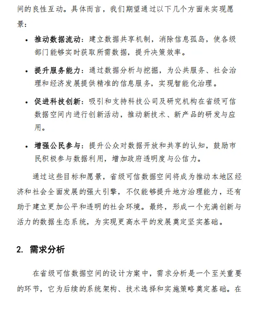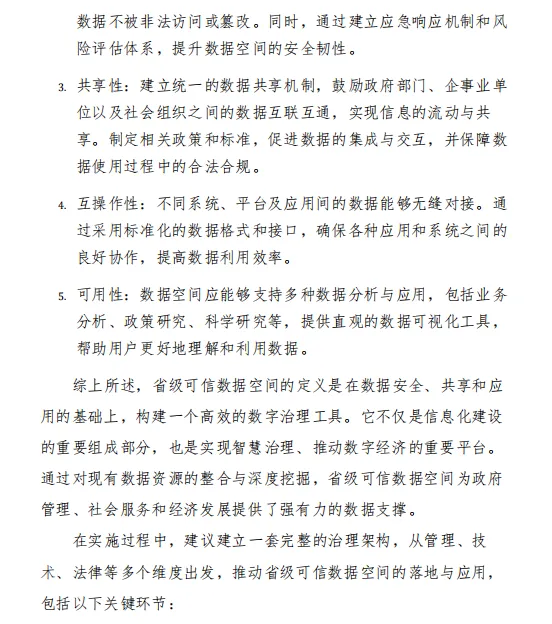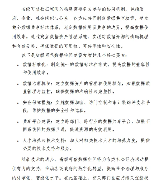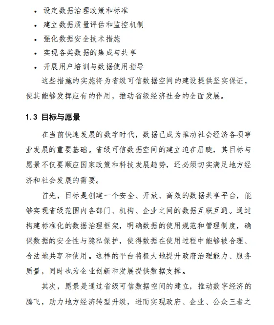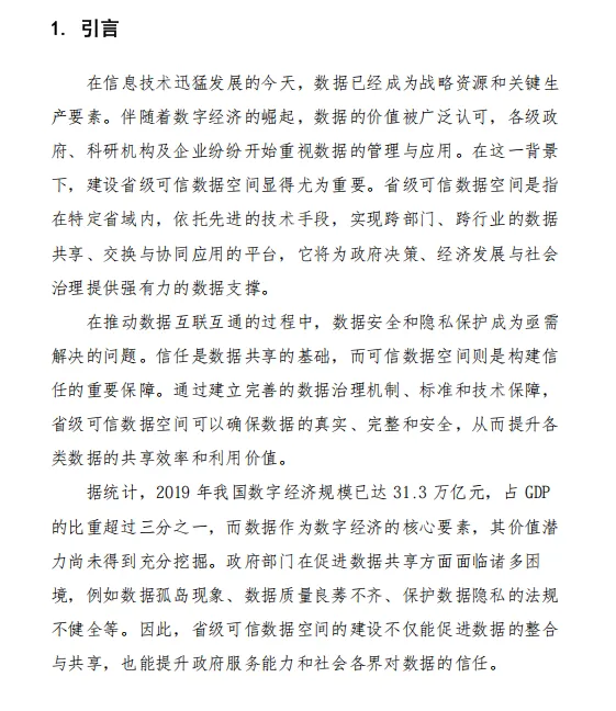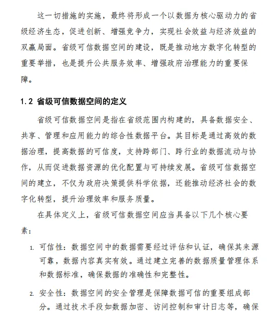 本方案立足于数字中国战略与数据要素市场化配置改革背景,针对当前省级政务数据存在的"孤岛化"、标准不一、安全合规风险突出等痛点,提出构建**省级可信数据空间**的系统性解决方案。该方案旨在打造覆盖全省、跨部门、跨行业的数据流通基础设施,通过"数据不动模型动、数据可用不可见"的可信机制,实现政府、企业与社会组织间数据的安全共享与价值释放。