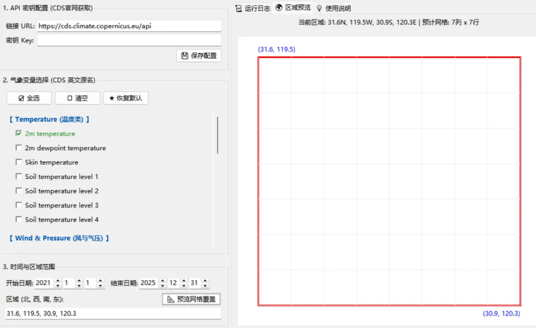 贴心功能:点击“📐 预览网格覆盖”,可以看到你的研究区包含了多少个格点,防止选错区域!