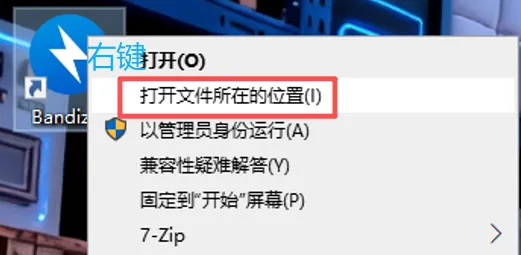找到桌面Bandizip快捷方式,右键选择打开文件所在的位置;