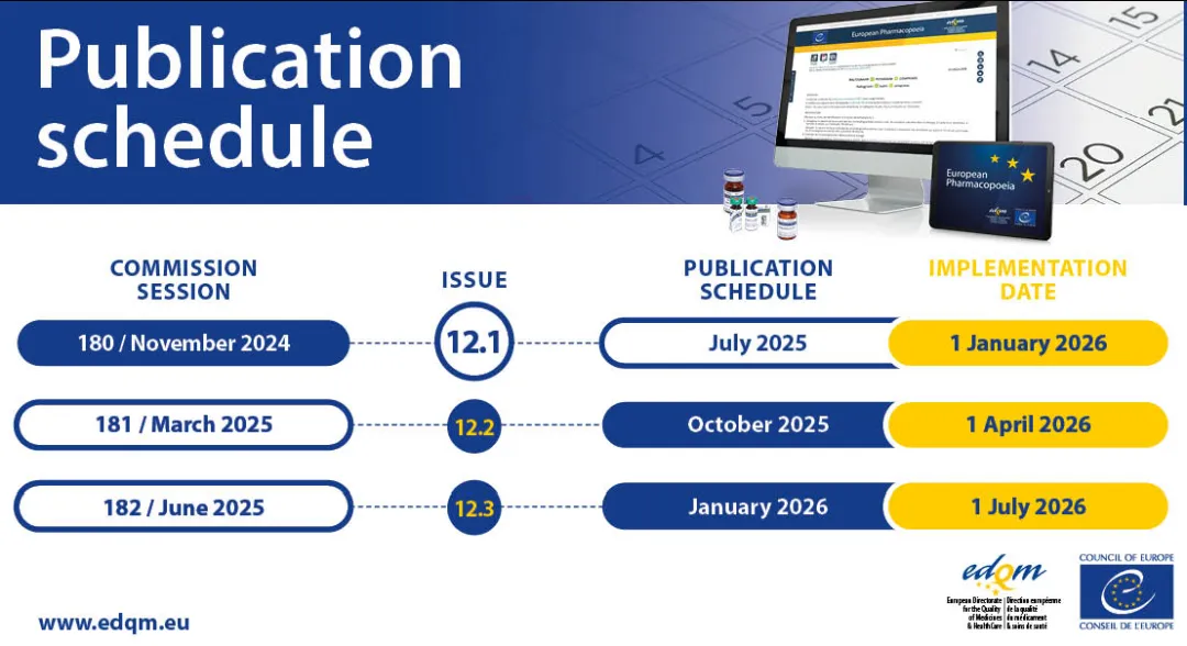欧洲药典(European Pharmacopoeia, EP) 第12.1版更新内容正式发布,涵盖多项新增、修订和废止文本,部分内容将于2026年1月1日起实施。