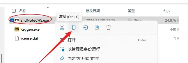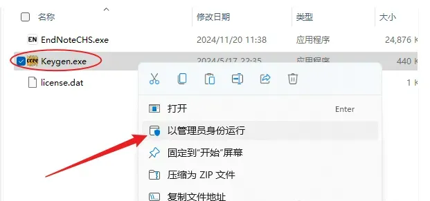 19.打开安装包解压后的【EndNote 21.5】文件夹中的【Crack】文件夹,鼠标右击【Keygen】选择【以管理员身份运行】。
