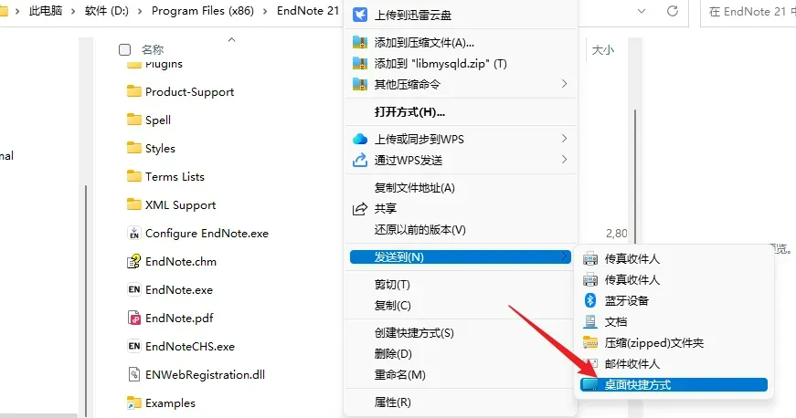 18.创建EnNote中文版桌面快捷方式:①鼠标右击粘贴过来的【EndNoteCHS】②选择【发送到】③点击【桌面快捷方式】。
