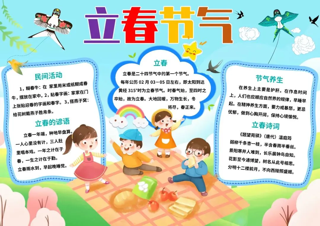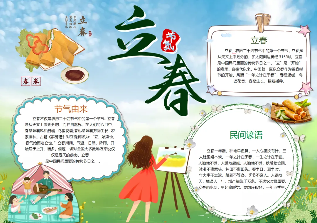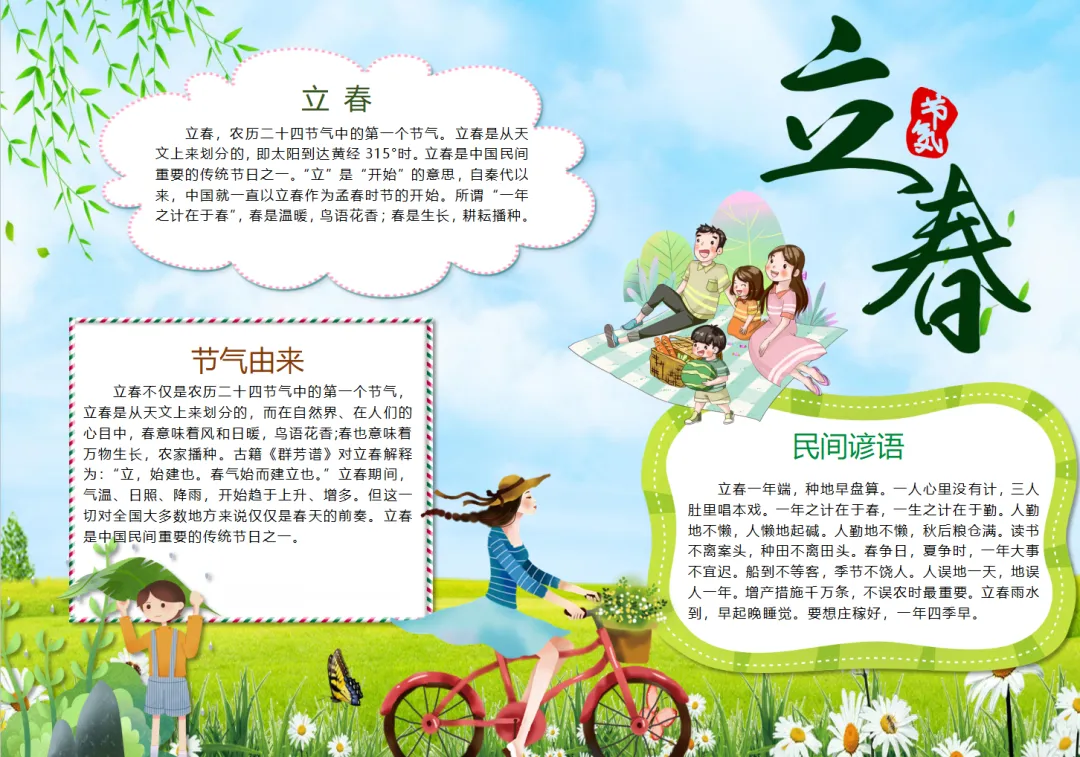 小清新二十四节气立春春天春卷野餐自行车民间节气小报