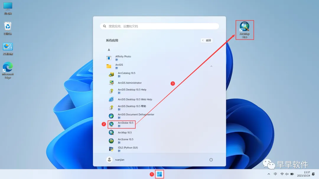 33、回到桌面,点击任务栏的【开始菜单】,在【所有应用】中找到【ArcMap 10.5软件图标】,将软件图标拖到桌面上,完成软件桌面快捷方式的创建