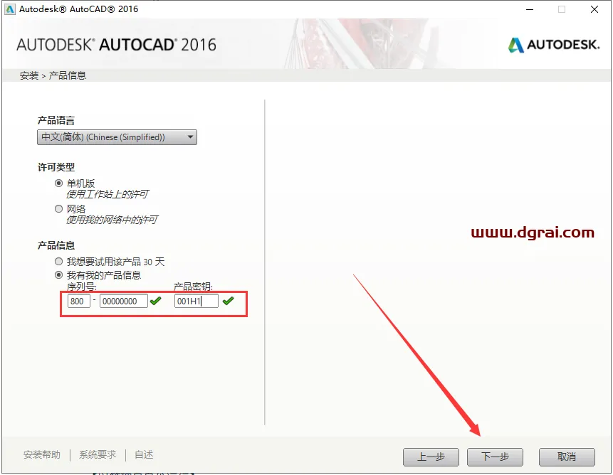 输入序列号【800-00000000】和产品密钥【001H1】,然后下一步