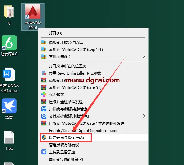 在电脑桌面找到AutoCAD 2016软件,鼠标右键以管理员身份运行
