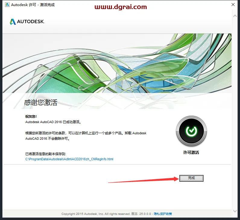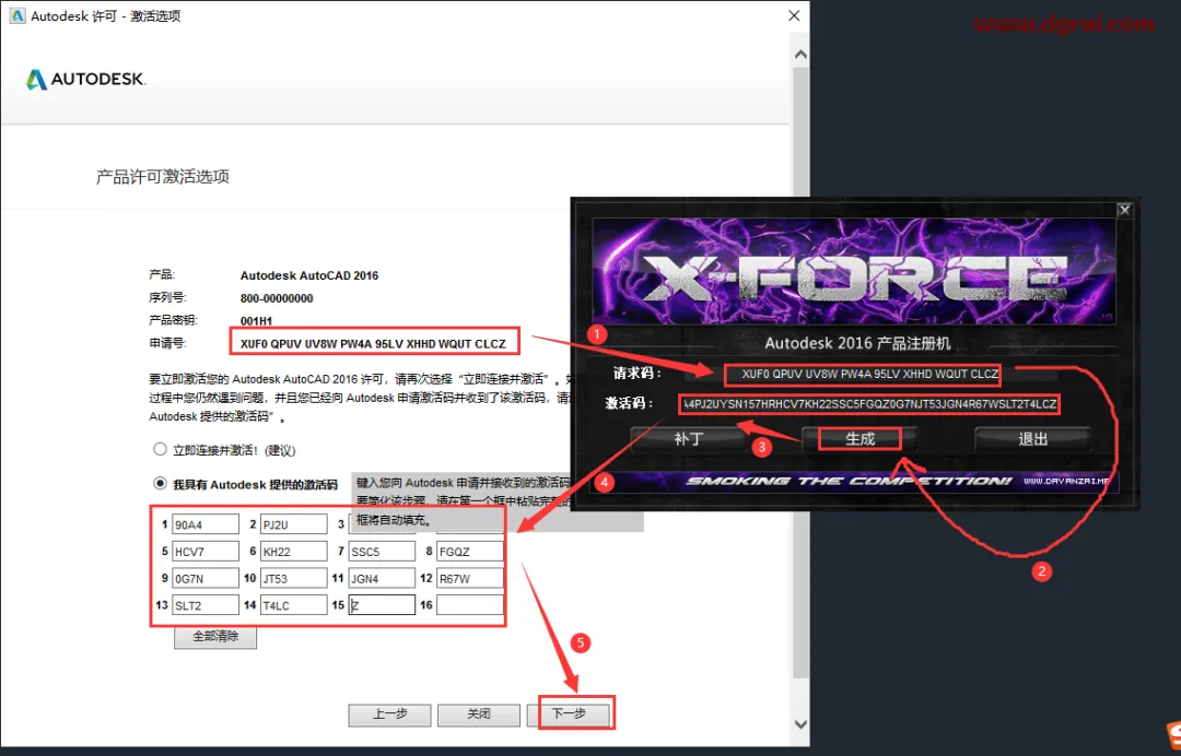 1.将产品许可激活选项界面的申请号复制到注册机Request栏 2.点击【生成】按钮生成激活码 3.复制生成的激活码到【我具有Autodesk提供的激活码】中 4.点击下一步