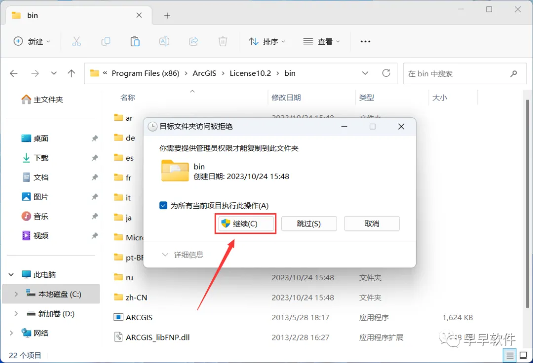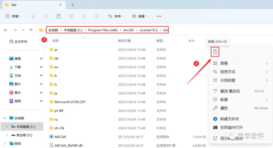 32、打开路径:C:\Program Files (x86)\ ArcGIS\ Desktop10.2\bin,再右键文件夹的空白处,点击【粘贴按钮】