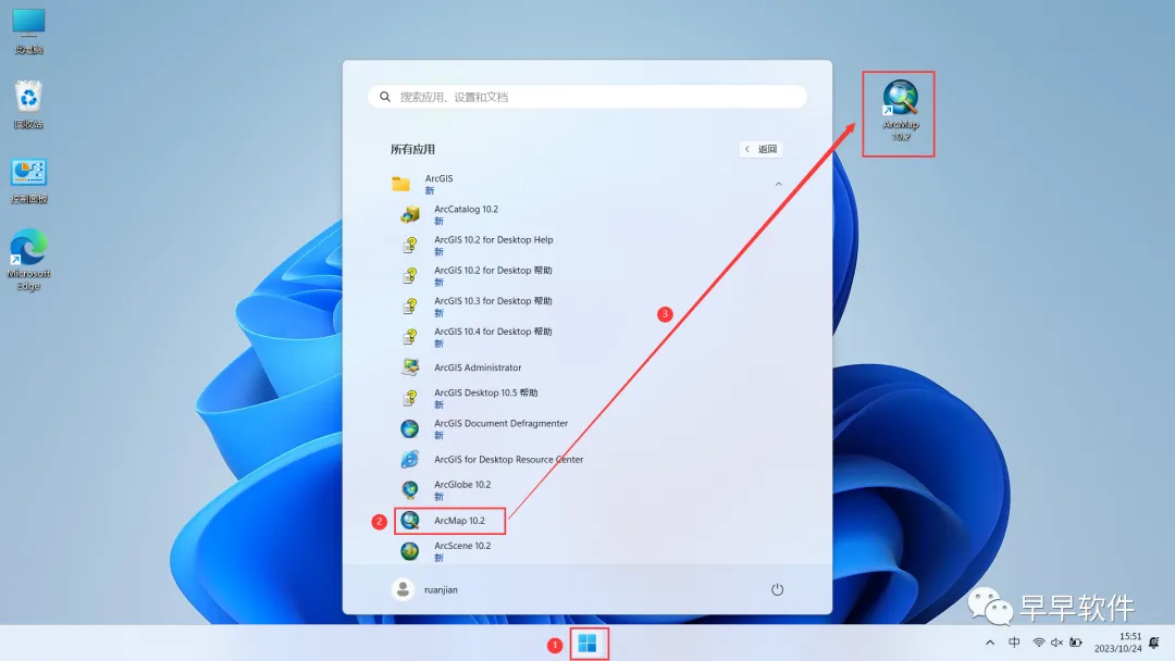 35、回到桌面,点击任务栏的【开始菜单】,在【所有应用】中找到【ArcMap 10.2软件图标】,将软件图标拖到桌面上,完成软件桌面快捷方式的创建
