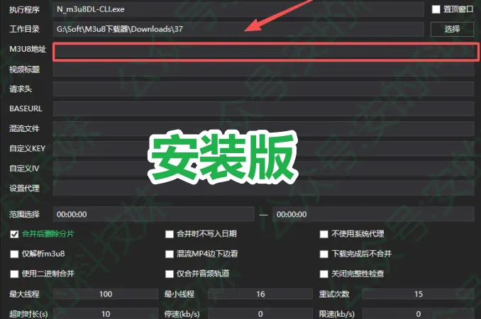 关键设置其实只有两步,小白也能秒上手:选好“工作目录”,指定视频保存的文件夹(比如G:\Soft\M3u8下载器\Downloads\37);粘贴m3u8地址,把需要下载的视频链接输入对应框内。
