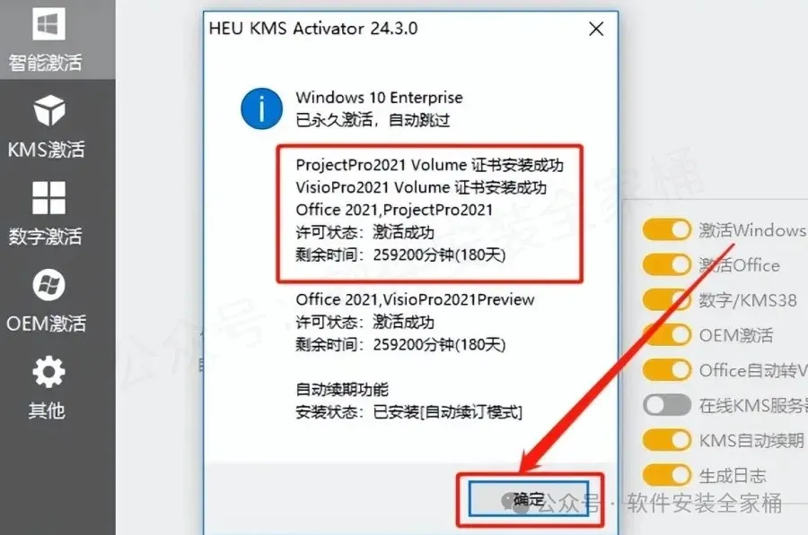 9.弹出的提示框中显示激活成功,有效期为180天,直接点击【确定】,180天后如果到期,再次激活即可。