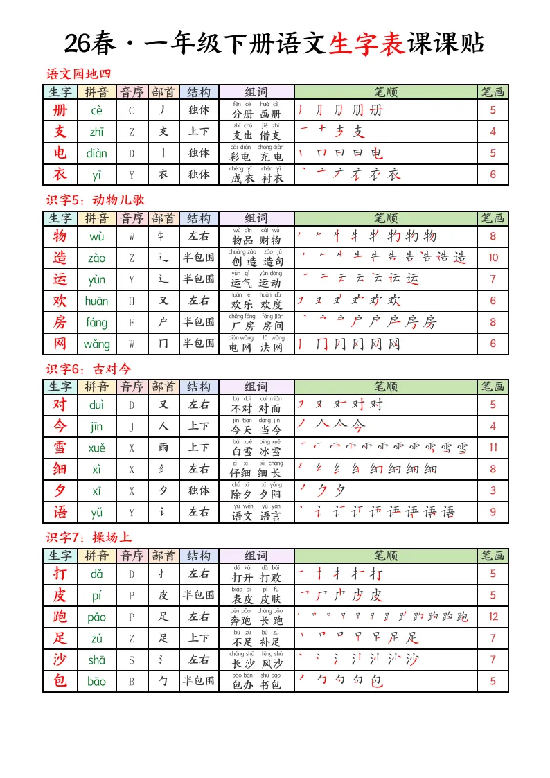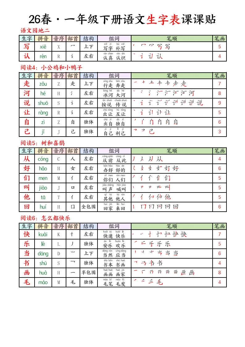 本次分享的是 2026春最新版 小学语文《生字表课课贴》,覆盖 1-6年级上下册。