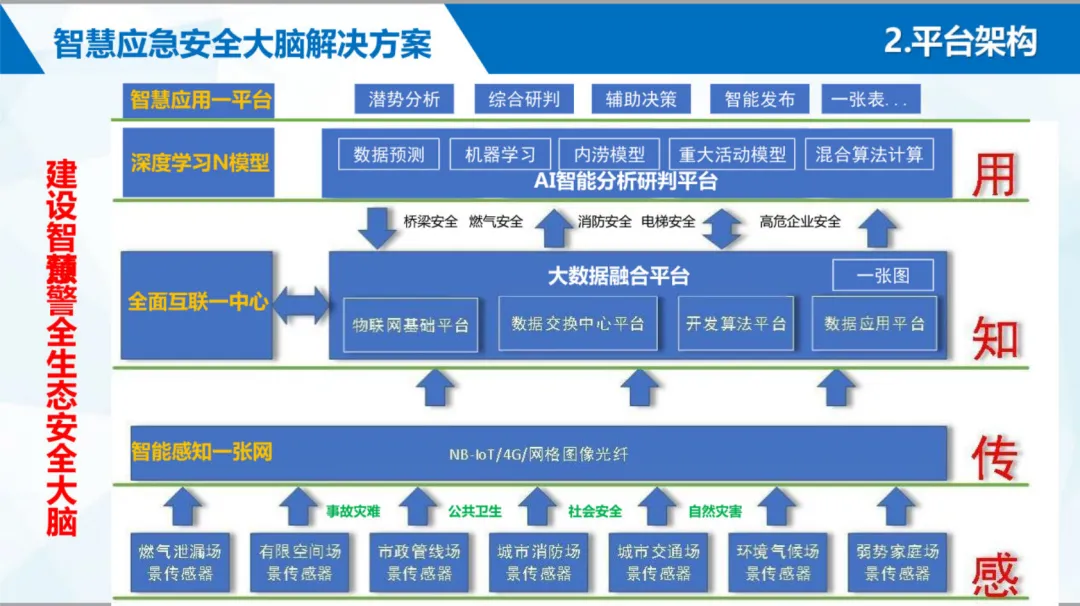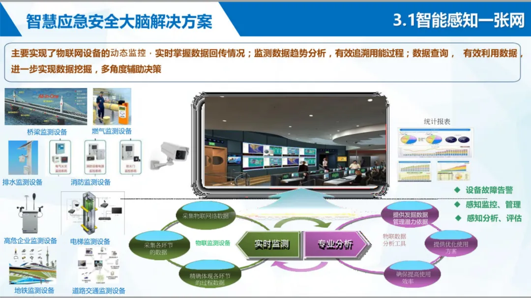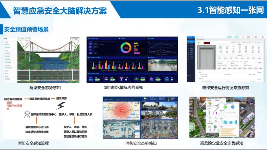 第一层:“智能感知一张网”,打造全域覆盖的“神经末梢”。 以低功耗物联网等技术为主,在城市生命线工程、公共安全、生产安全等领域广泛部署智能传感器。它们如同城市的神经元,7x24小时不间断地监测燃气泄漏、桥梁位移、消防栓水压、地下管廊水位、电梯运行状态等,实现风险源的动态实时感知。