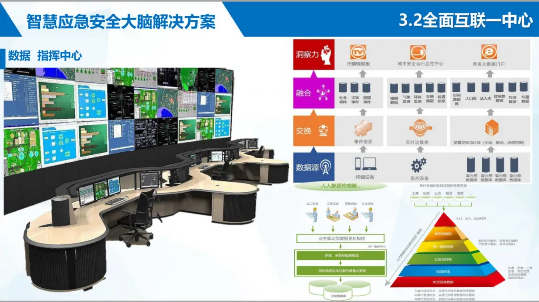 第二层:“全面互联一中心”,打造汇聚融合的“神经中枢”。 这是破解“信息孤岛”的关键。通过建设统一的数据汇聚与交换中心,横向打通应急、城管、交通、水务、公安、卫健等各部门数据,纵向整合历史数据、实时监测数据、地理信息、人口法人信息等。这意味着,在面对一场暴雨引发的内涝时,指挥中心可以同时看到气象雷达图、河道水位、地下管网流量、路面实时视频、受影响社区人口结构,实现真正的“一屏统览、数据融合”。