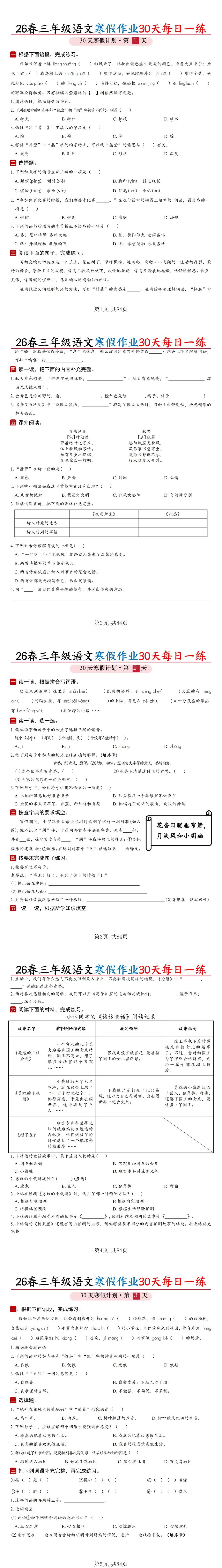 26年春新版三年级语文寒假作业每日一练(免费下载)