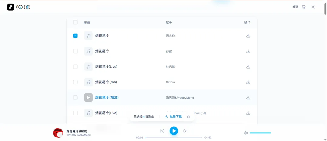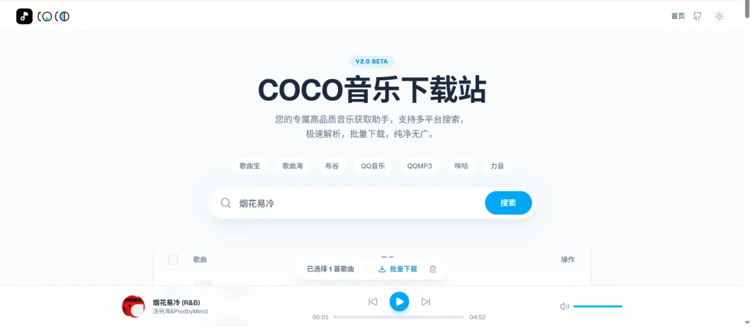 hello大家好,我是反调,今天给大家分享一个开源项目COCO音乐下载站。可以免费的部署在CloudFlare Pages、Vercel、EdgeOne Pages等server less上。它是一个基于 Next.js 16 构建的现代化音乐搜索与下载平台。界面设计简约纯净,支持多渠道音乐搜索、在线试听、批量下载,并配备了丝滑的暗黑模式。无广告、极速、纯净的音乐获取体验。
