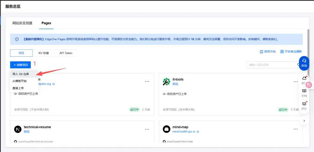 该项目可以部署在CloudFlare Pages、Vercel、EdgeOne Pages等server less上。选择你们自己常用的平台就行了,这里我选择EdgeOne Pages。其他平台部署方式一样的。