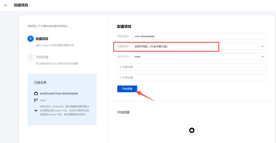 3、项目名称自定义,加速区域(有备案的域名选择全球包含中国大陆,没有备案的选择全球不含中国大陆),其他默认,点击部署