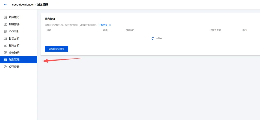 在项目中的点击【域名管理】->【添加自定义域名】