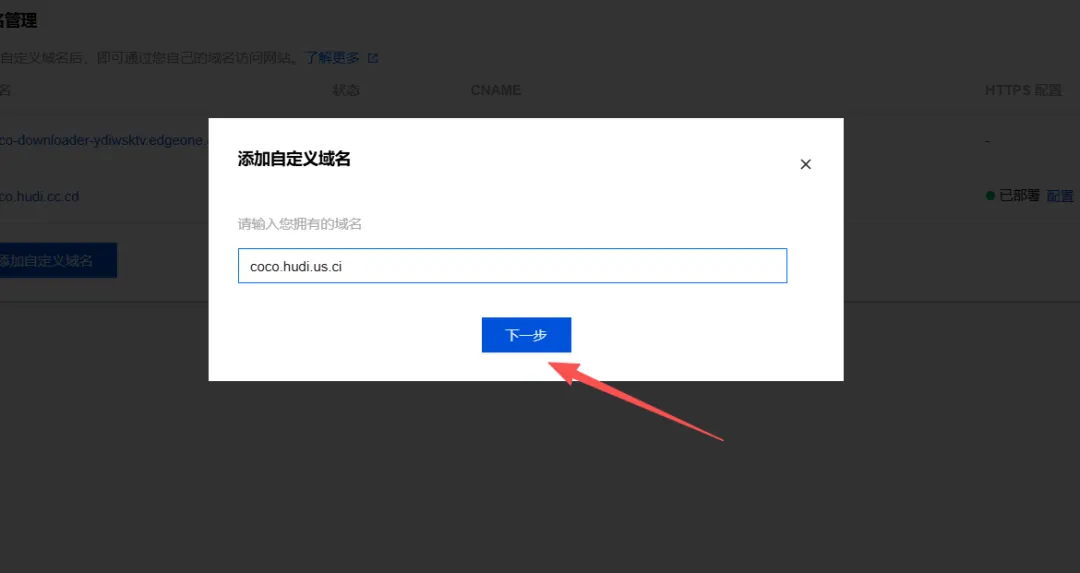 输入想要绑定的子域名,例如我的coco.hudi.us.ci,然后点击下一步
