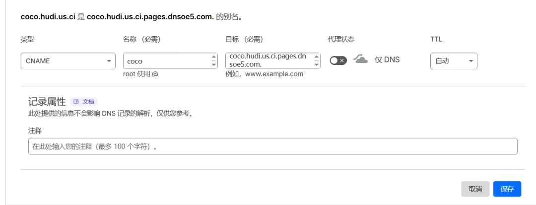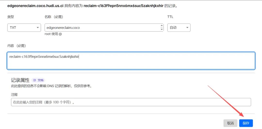 通过在hudi.us.ci的dns域名解析上添加txt记录。值的信息如上面截图,由于我把域名托管到cloudflare了,如下,点击保存。