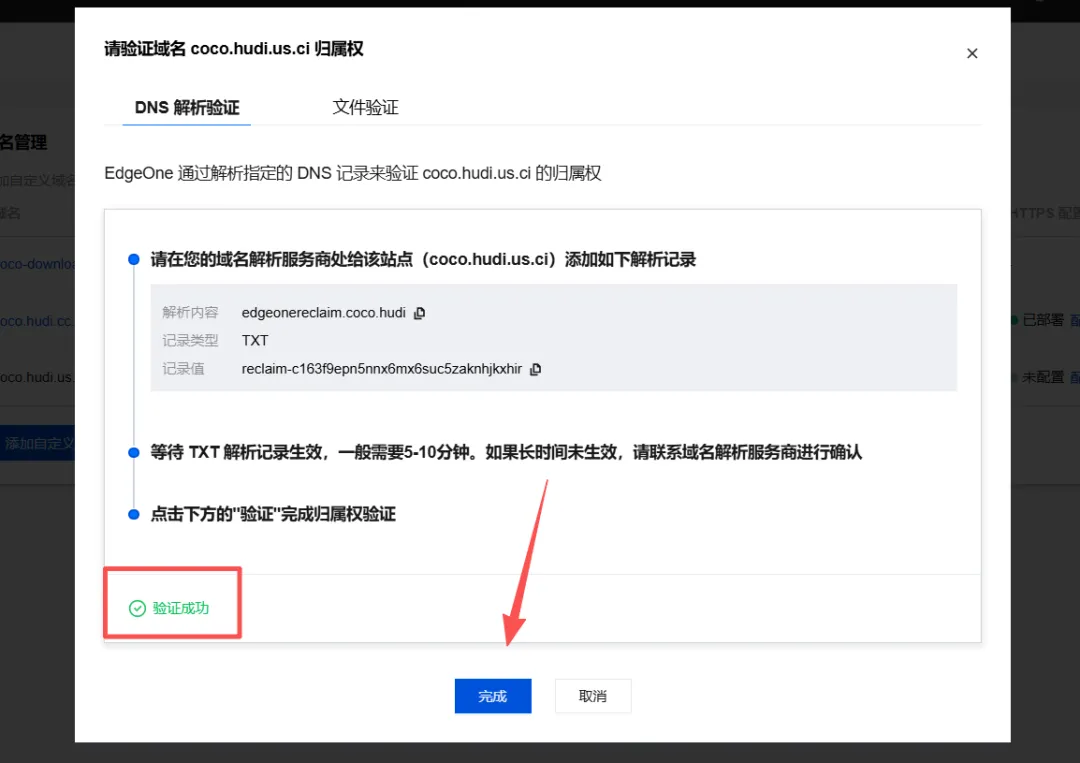 回到EdgeOne Pages的点击验证按钮,如下。会提示验证通过,点击完成按钮