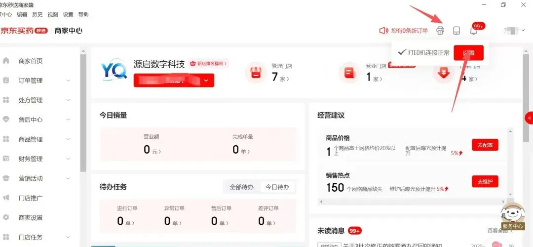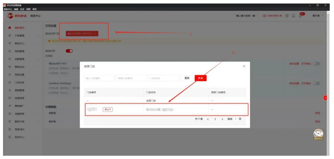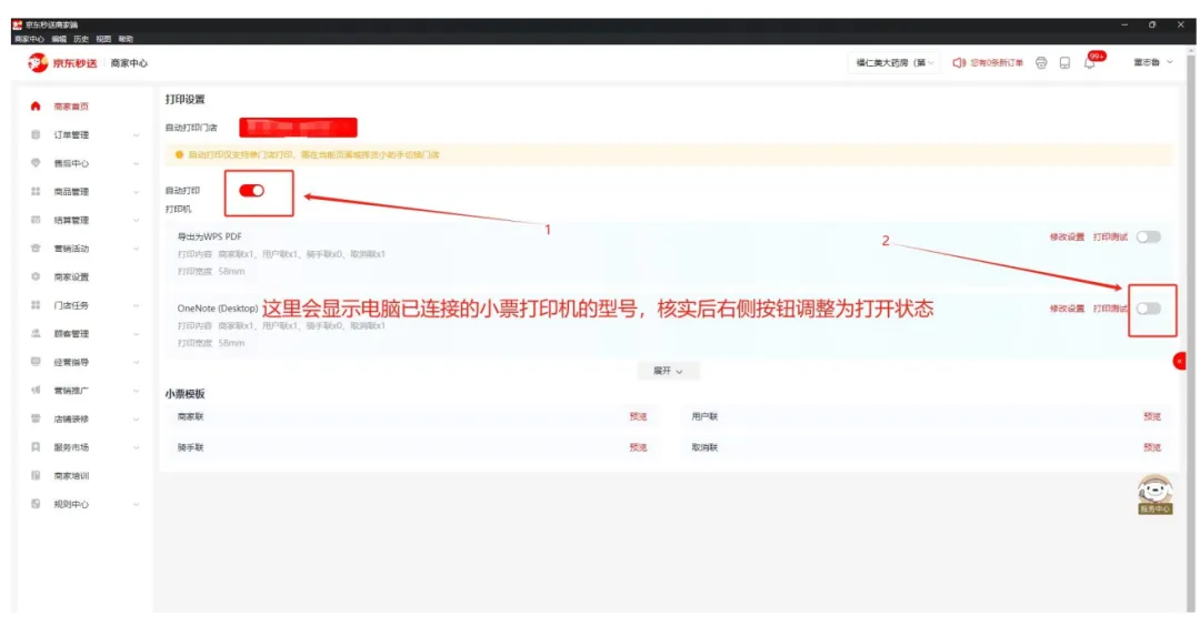 1、如出现按钮已调整为红色开启状态,但打印测试无反应。则需点击商家名称,重新选择一下店铺链接;
