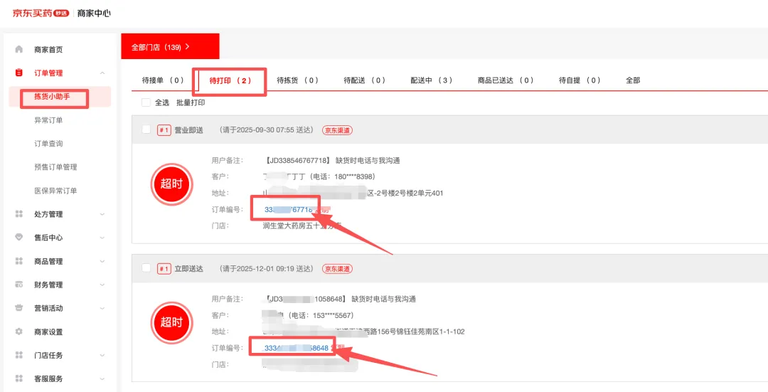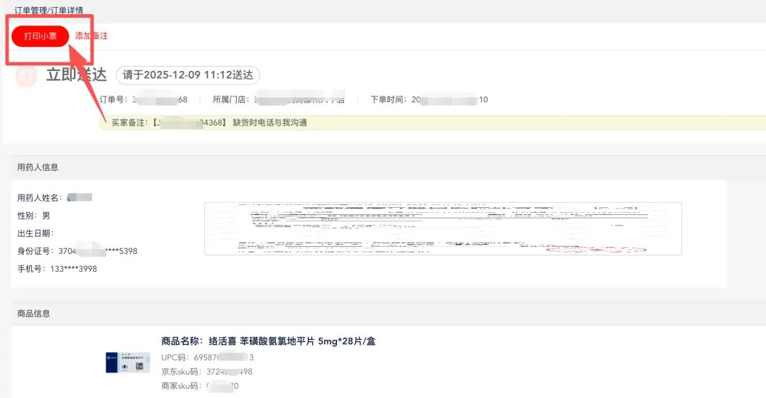 2、在订单详情页左上角,点击“打印小票”可进行多次打印
