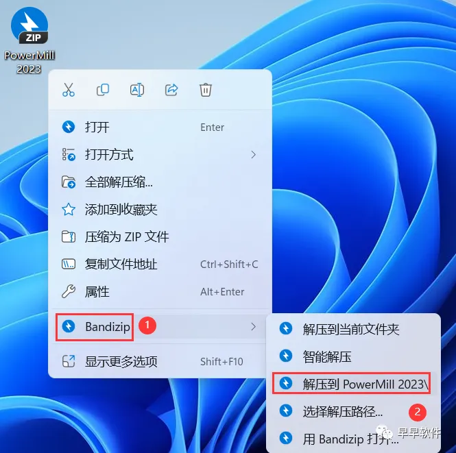 1、下载PowerMill 2023软件安装包到电脑上,右键选择【解压到PowerMill 2023\】