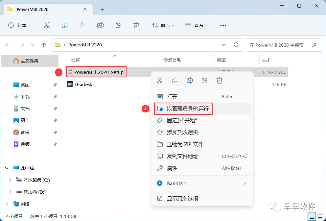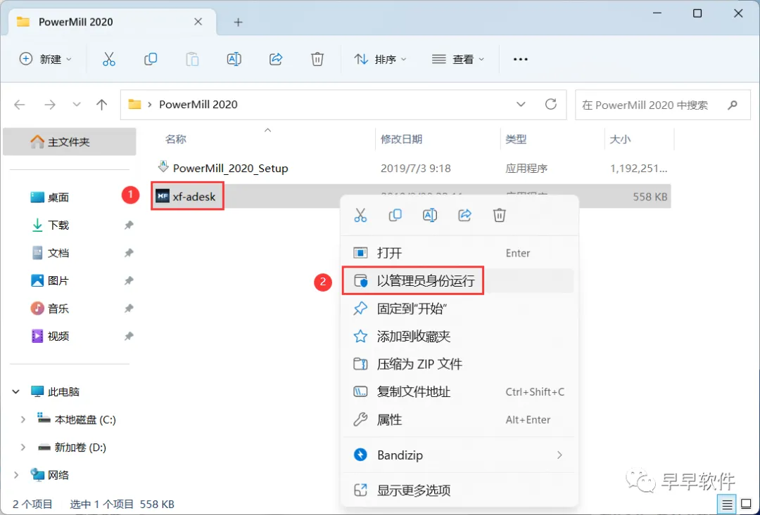 20、回到PowerMill 2020文件夹,找到【xf-adesk】程序,右键选择【以管理员身份运行】它