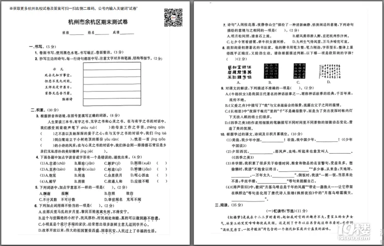 今天为大家准备的是家长上传的余杭区小学语文的五年级上期末测试卷,获取试卷完整电子版pdf免费下载及参考答案分析请点击文中的小程序!