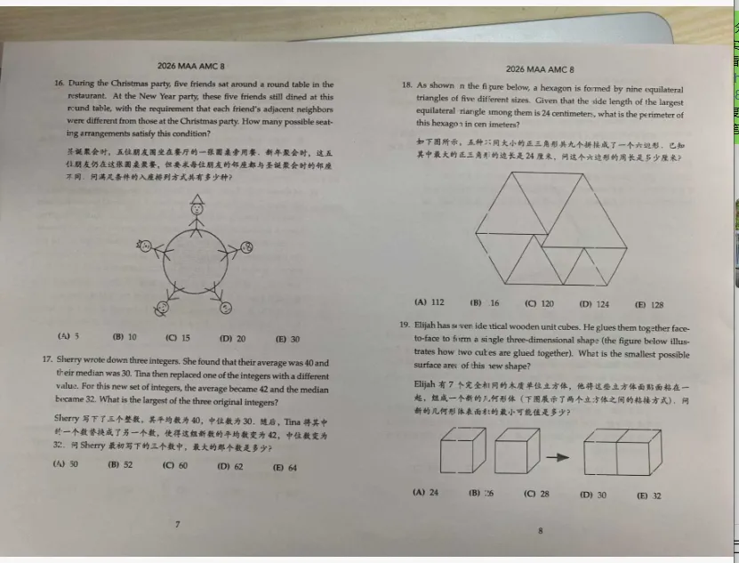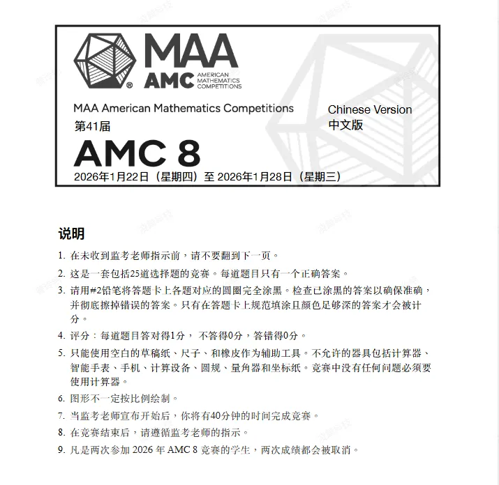 3. 美国区AMC8真题:原汁原味的海外命题,难度略有区分,能帮助考生拓展解题视野、熟悉海外命题思路,适配想要冲击高分、拓展竞赛思维的学生,补充国内真题的备考盲区。关注本公众号