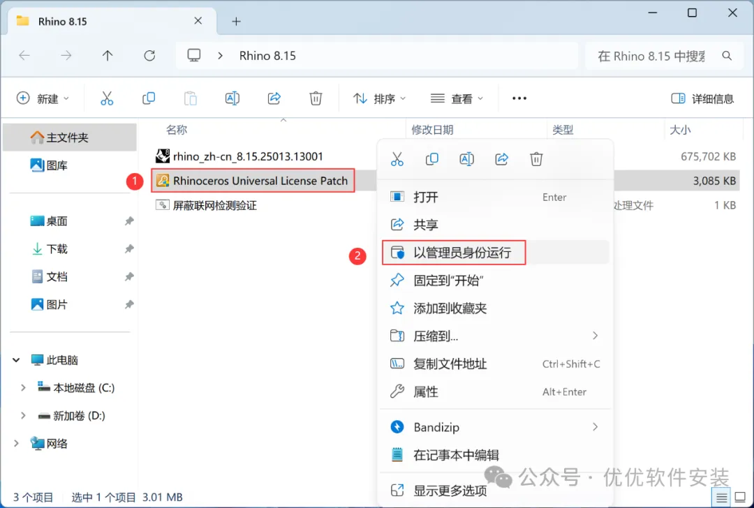 8、回到Rhino 8.15文件夹,找到【Rhinoceros…Patch】程序,右键选择【以管理员身份运行】它