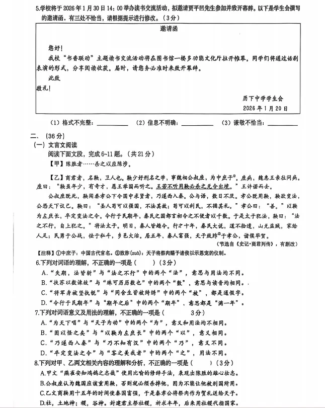 【免费下载】2026.01 历城区七年级上期末【历史】真题,附解析