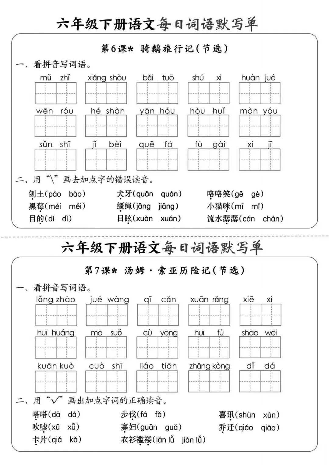 小学语文六年级下册《每日词语默写单》 可免费下载打印