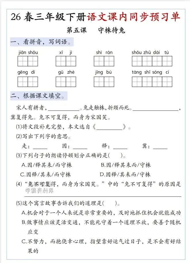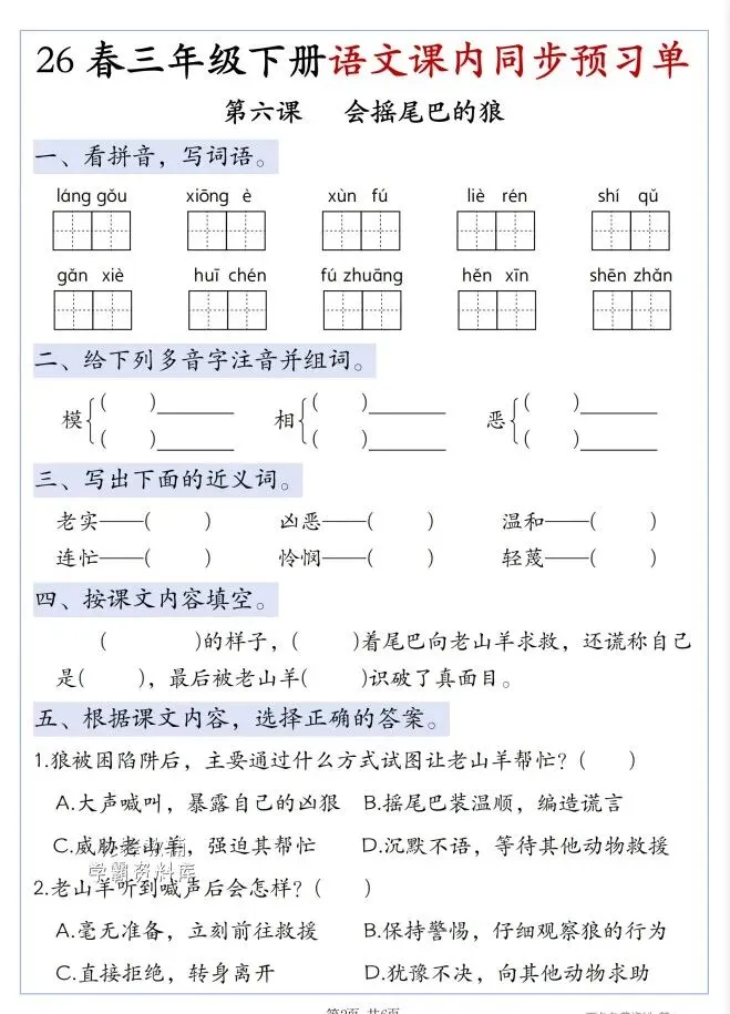今天给大家整理了26春三年级下册语文第二单元寒假预习单,转发给朋友或班级群,受益更多人,帮助孩子学习!