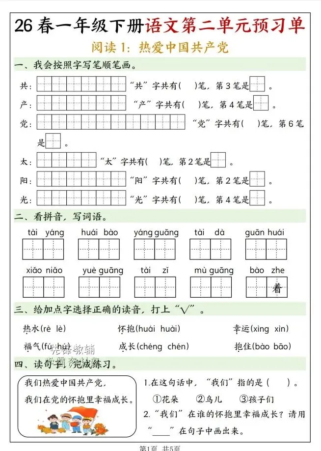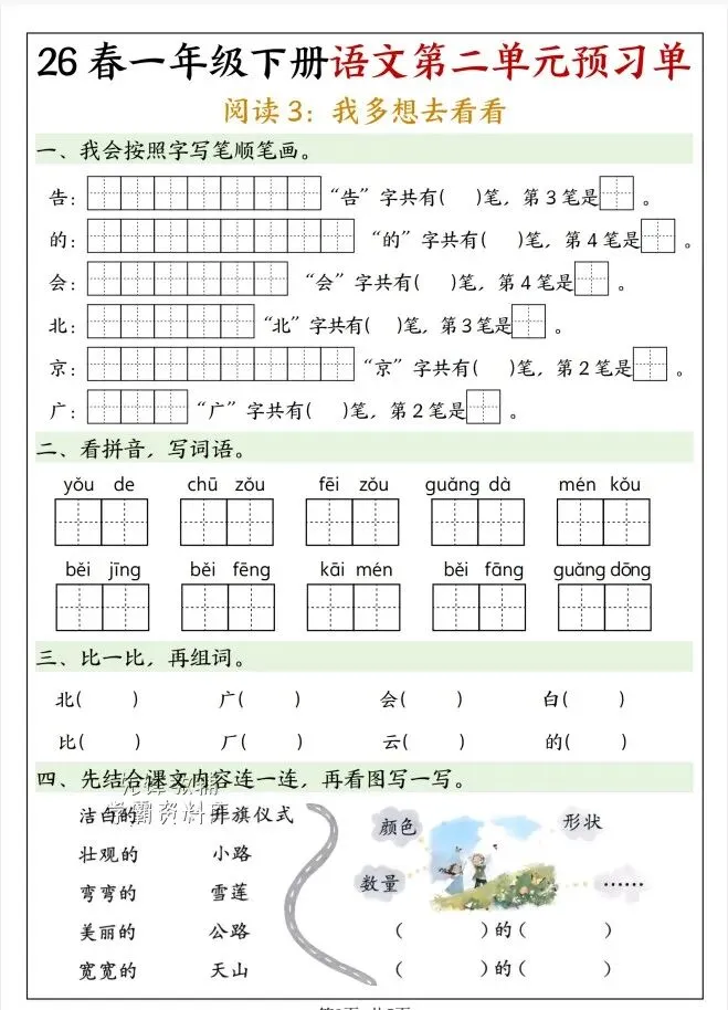 今天给大家整理了26春一年级下册语文第二单元寒假预习单,转发给朋友或班级群,受益更多人,帮助孩子学习!