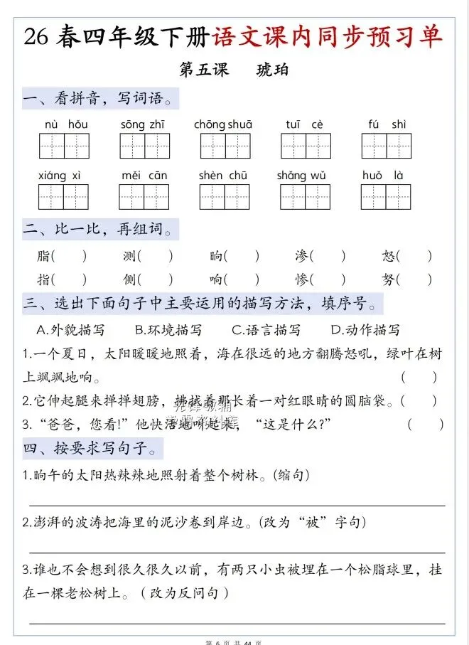 文末免费下载|26春四年级下册语文第二单元寒假预习单