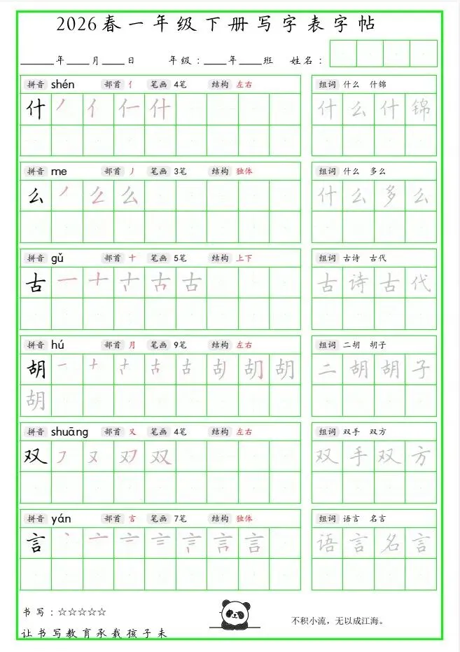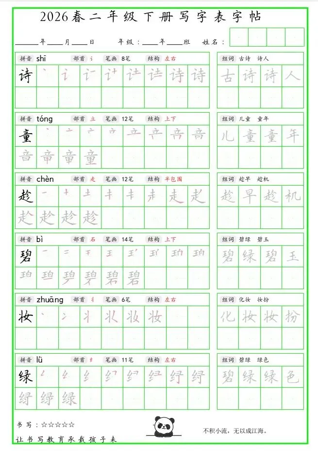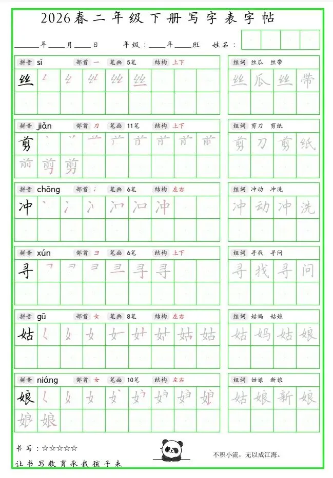 「26春 二下写字表笔顺组词字帖(绿色).pdf」链接:https://pan.quark.cn/s/b8a1b5b8f053