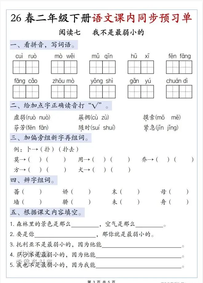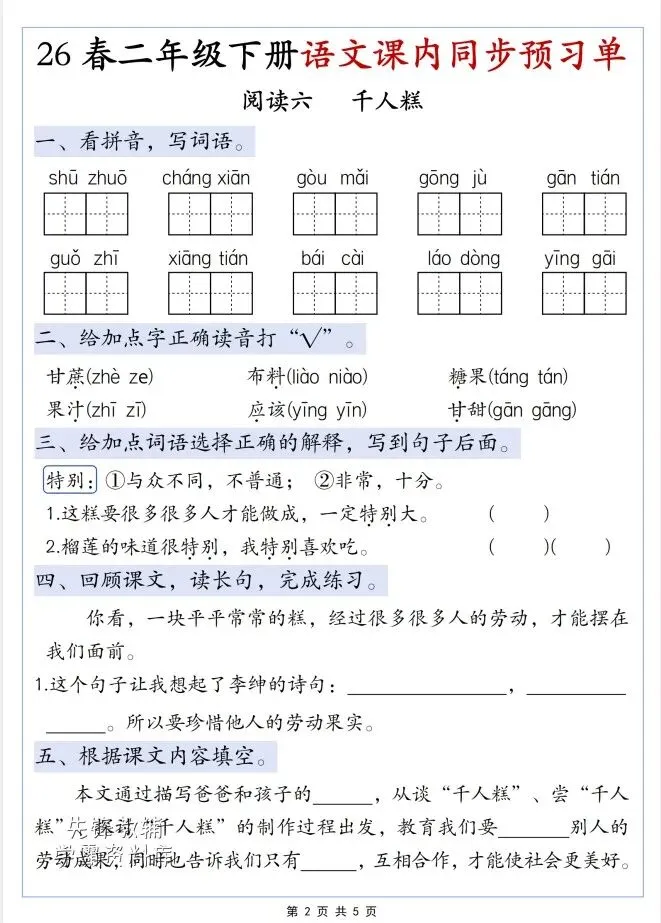 今天给大家整理了26春二年级下册语文第二单元寒假预习单,转发给朋友或班级群,受益更多人,帮助孩子学习!