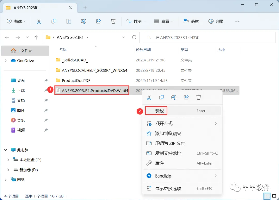 3、找到【ANSYS.2023.R1.Products.DVD】文件,右键点击【装载】