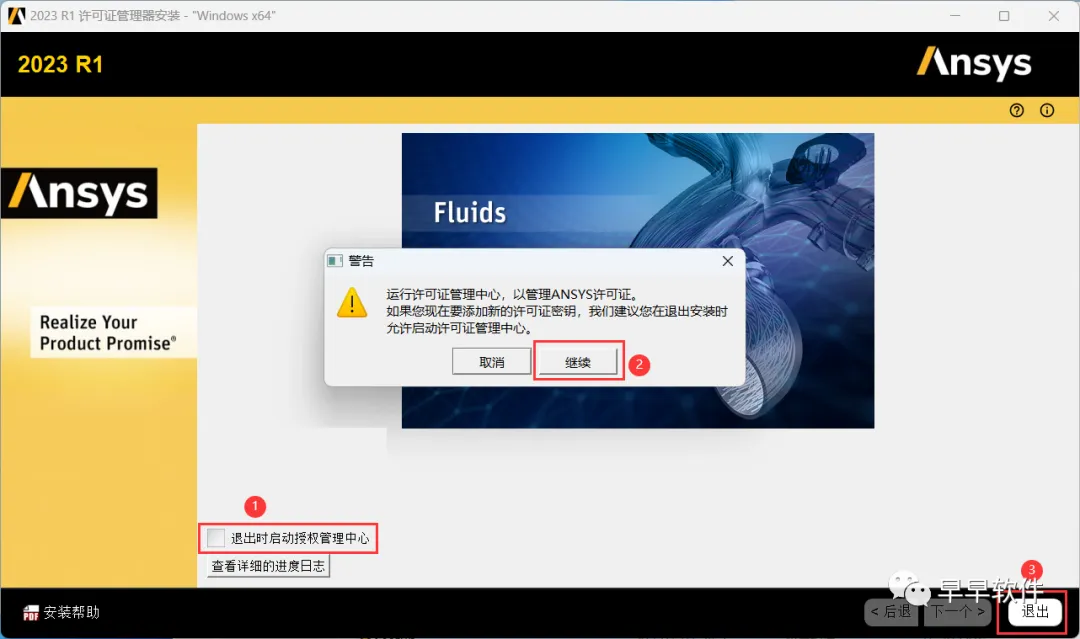 13、不勾选【退出时启动授权管理中心】,点击【继续】,再点击【退出】
