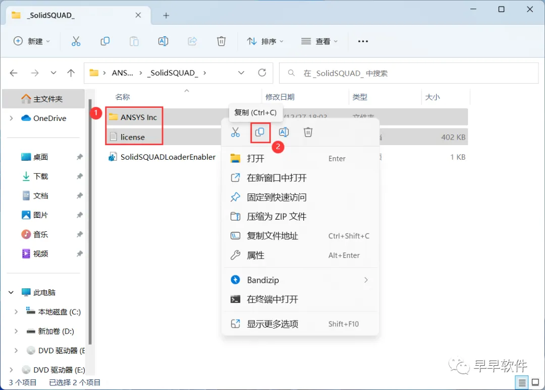 15、选中【ANSYS Inc】和【license】文件,右键点击【复制按钮】