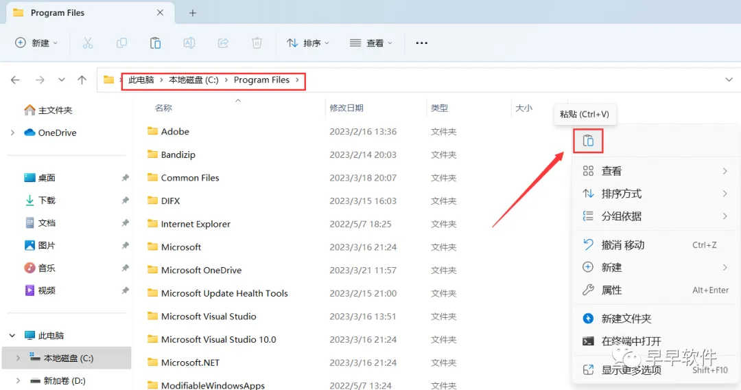 27、回到C盘下的Program Files文件夹,右键文件夹的空白处,点击【粘贴按钮】