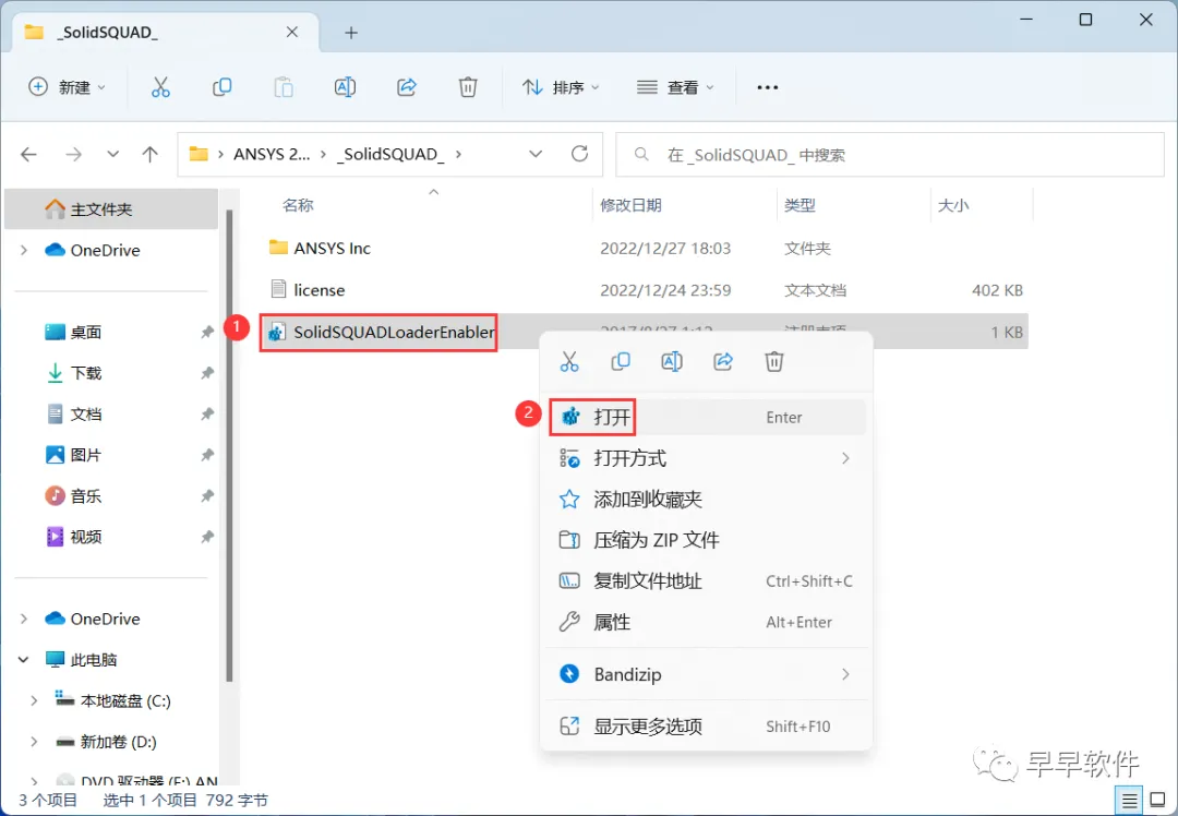 46、回到ANSYS 2023R1文件夹下的_SolidSQUAD_文件夹,找到【SolidSQUADLoaderEnabler】文件,右键【打开】它