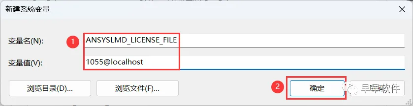 53、变量名输入:ANSYSLMD_LICENSE_FILE;变量值输入:1055@localhost,再点击【确定】
