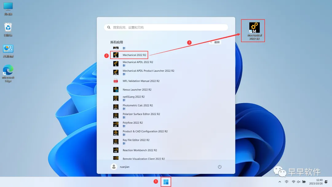 56、回到桌面,点击任务栏的【开始菜单】,在【所有应用】中找到【Mechanical 2023 R1软件图标】,将软件图标拖到桌面上,完成软件桌面快捷方式的创建