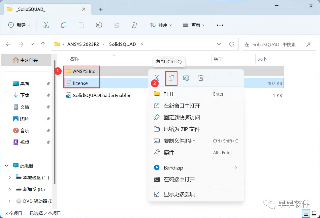 15、选中【ANSYS Inc】和【license】文件,右键点击【复制按钮】