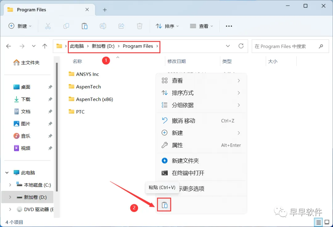 16、打开路径:D:\Program Files,再右键文件夹的空白处,点击【粘贴按钮】